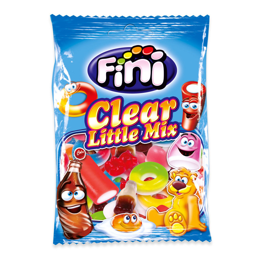 Fini Little Mix contiene un surtido de gomas y regaliz dulce; botellas de cola, huevos fritos, aros de varios sabores, mini besos y tacos de regaliz dulce.